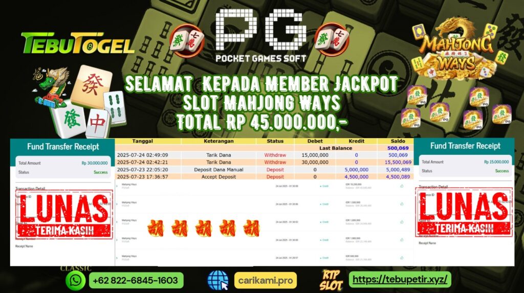 BUKTI JACKPOT SLOT MAHJONG WAYS Rp 45.000.000,- LUNAS