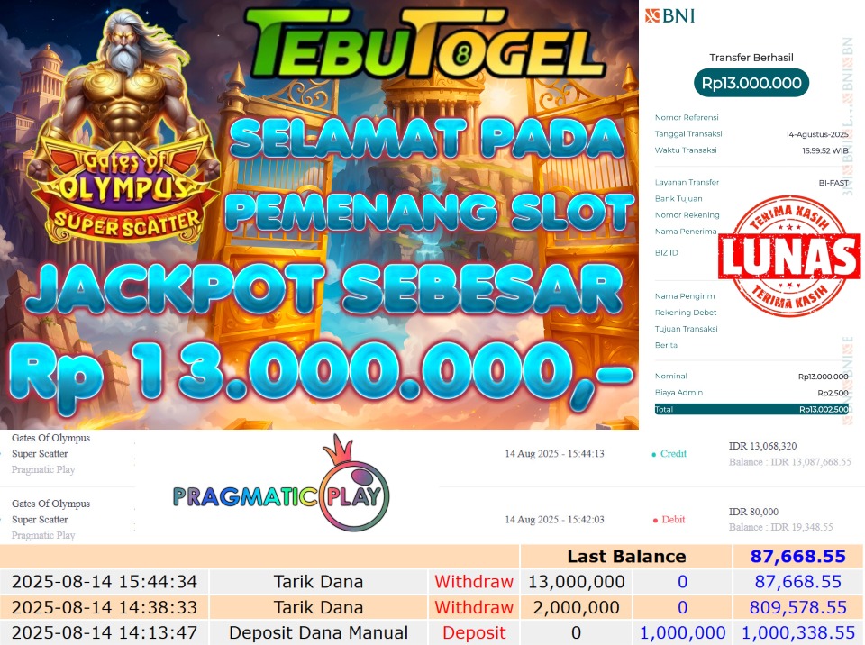 Selamat kepada User id : KOKO*** telah berhasil mendapatkan kemenangan besar pada permainan SLOT GATES OF OLYMPUS SUPER SCATTER dengan kemenangan sebesar Rp 13.000.000,- Setelah mengisi formulir withdraw dengan kurung waktu hanya 5 – 10 menit pihak TebuTogel sudah melakukan transfer kepada pemilik User id dan dana sudah dapat dicairkan oleh pemenang. Bukti pembayaran yang kami berikan merupakan bukti pembayaran yang SAH / VALID yang langung didapatkan melalui tanda transfer transaksi dari Bank yang dituju.