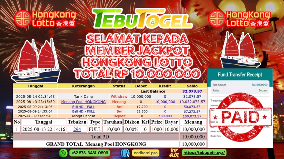 Selamat kepada User id : NICHOL**** telah berhasil mendapatkan kemenangan besar pada permainan TOGEL HONGKONG LOTTOdengan kemenangan sebesar Rp 10.000.000,- Setelah mengisi formulir withdraw dengan kurung waktu hanya 5 – 10 menit pihak TebuTogel sudah melakukan transfer kepada pemilik User id dan dana sudah dapat dicairkan oleh pemenang. Bukti pembayaran yang kami berikan merupakan bukti pembayaran yang SAH / VALID yang langung didapatkan melalui tanda transfer transaksi dari Bank yang dituju.