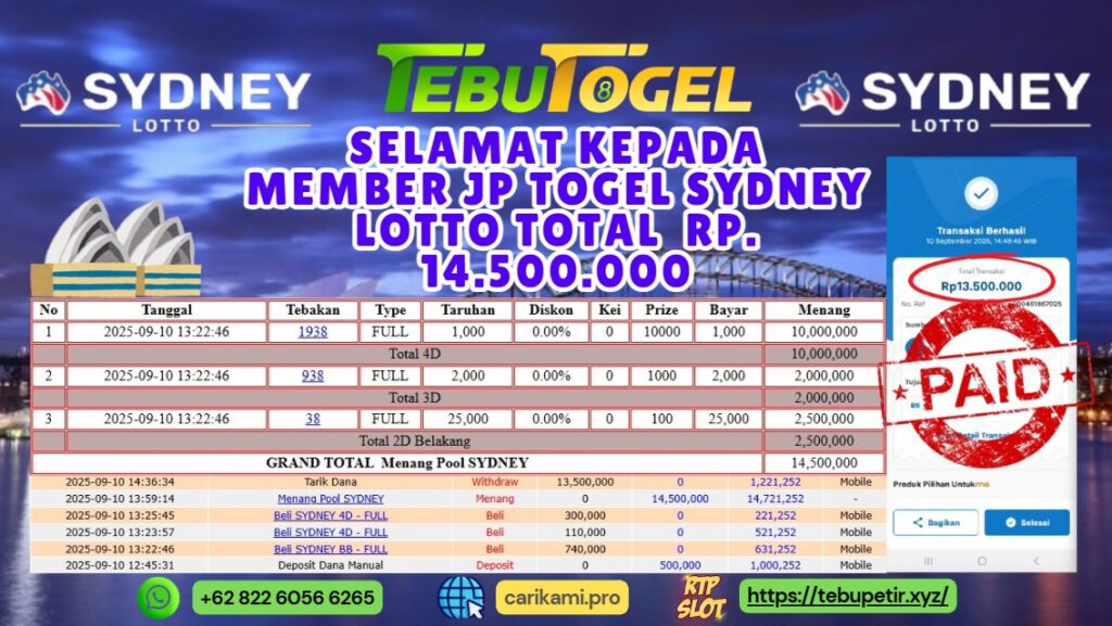 Selamat kepada User id : EBAN** telah berhasil mendapatkan kemenangan besar pada permainan TOGEL SYDNEY LOTTO dengan kemenangan sebesar Rp 14.500.000,- Setelah mengisi formulir withdraw dengan kurung waktu hanya 5 – 10 menit pihak TebuTogel sudah melakukan transfer kepada pemilik User id dan dana sudah dapat dicairkan oleh pemenang. Bukti pembayaran yang kami berikan merupakan bukti pembayaran yang SAH / VALID yang langung didapatkan melalui tanda transfer transaksi dari Bank yang dituju.