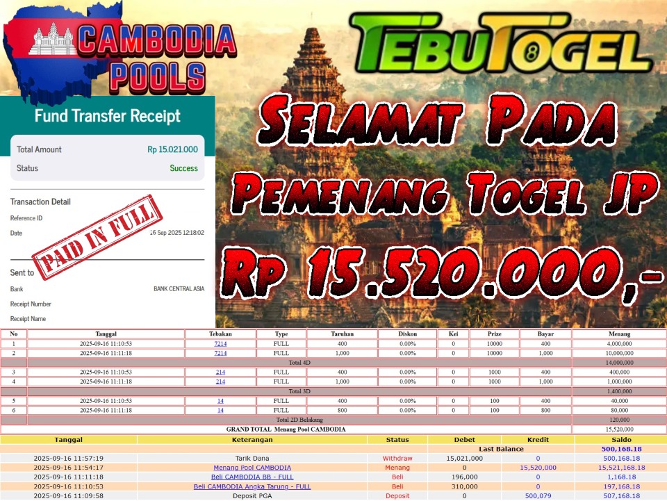 Selamat kepada User id : DANYA**** telah berhasil mendapatkan kemenangan besar pada permainan TOGEL CAMBODIA dengan kemenangan sebesar Rp 15.520.000,-… Baca selengkapnya...