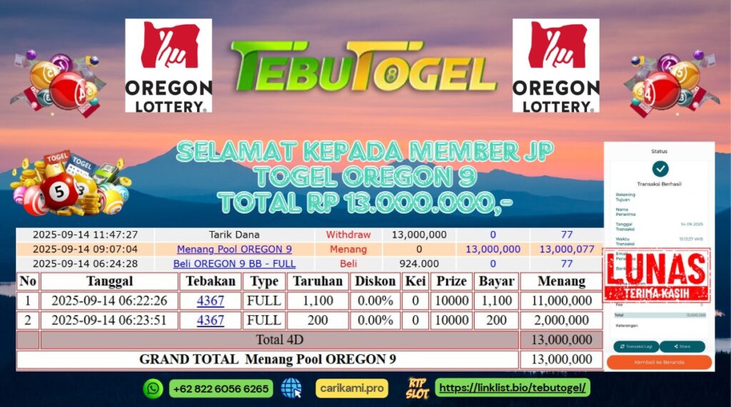 Selamat kepada User id : TERJAL*** telah berhasil mendapatkan kemenangan besar pada permainan TOGEL OREGON 9 dengan kemenangan sebesar Rp … Baca selengkapnya...