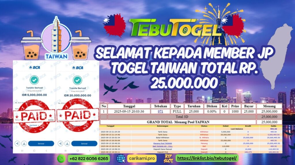 Selamat kepada User id : RAKS*** telah berhasil mendapatkan kemenangan besar pada permainan TOGEL TAIWAN dengan kemenangan sebesar Rp 25.000.000,-… Baca selengkapnya...