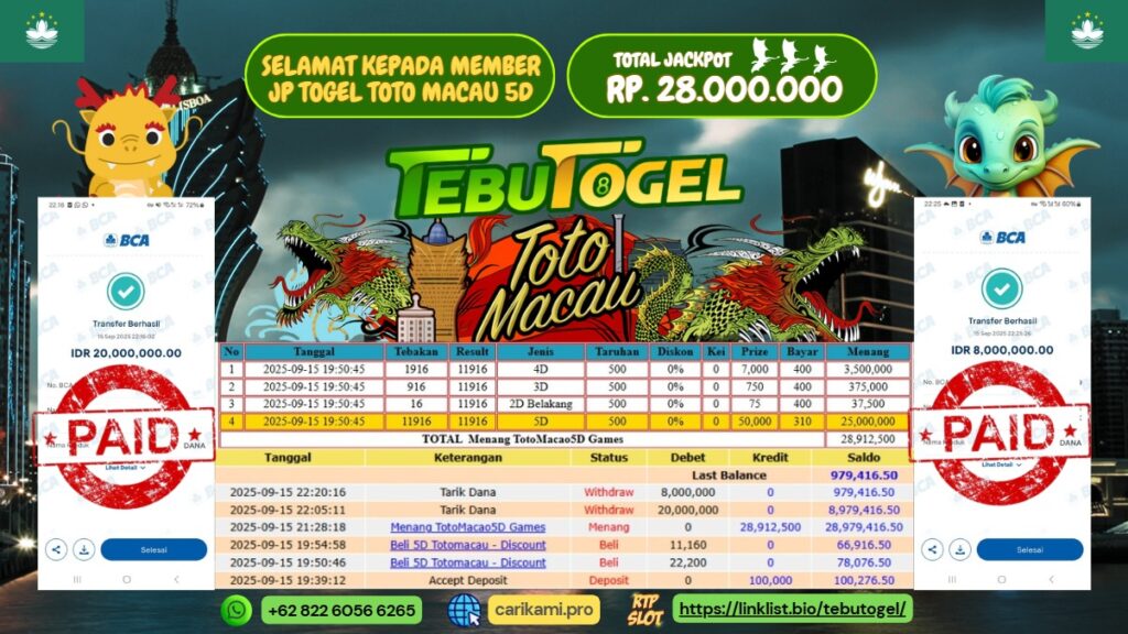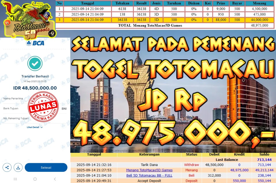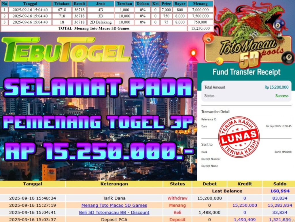 BUKTI JACKPOT TOGEL TOTO MACAU 5D Rp 15.250.000,- LUNAS