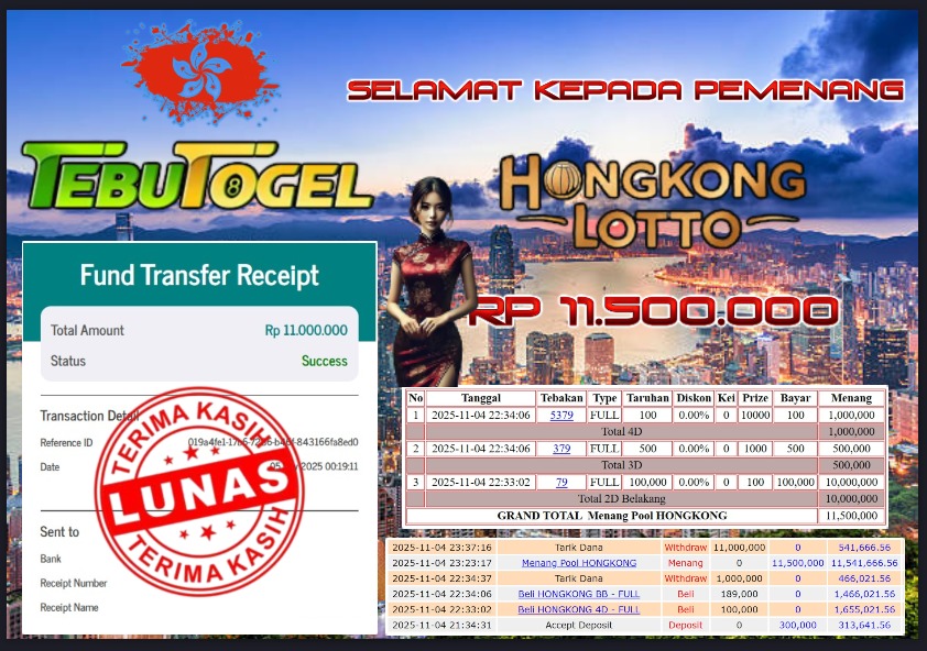 Selamat kepada User id : POCHIA**** telah berhasil mendapatkan kemenangan besar pada permainan TOGEL HONGKONG LOTTO dengan kemenangan sebesar Rp 11.500.000,- Setelah mengisi formulir withdraw dengan kurung waktu hanya 5 – 10 menit pihak TebuTogel sudah melakukan transfer kepada pemilik User id dan dana sudah dapat dicairkan oleh pemenang. Bukti pembayaran yang kami berikan merupakan bukti pembayaran yang SAH / VALID yang langung didapatkan melalui tanda transfer transaksi dari Bank yang dituju.