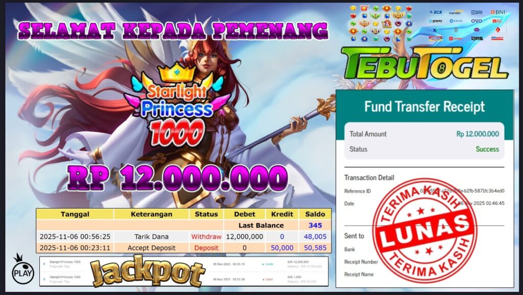 Selamat kepada User id : RASSH** telah berhasil mendapatkan kemenangan besar pada permainan SLOT STARLIGHT PRINCESS 1000 dengan kemenangan sebesar Rp 12.000.000- Setelah mengisi formulir withdraw dengan kurung waktu hanya 5 – 10 menit pihak TebuTogel sudah melakukan transfer kepada pemilik User id dan dana sudah dapat dicairkan oleh pemenang. Bukti pembayaran yang kami berikan merupakan bukti pembayaran yang SAH / VALID yang langung didapatkan melalui tanda transfer transaksi dari Bank yang dituju.