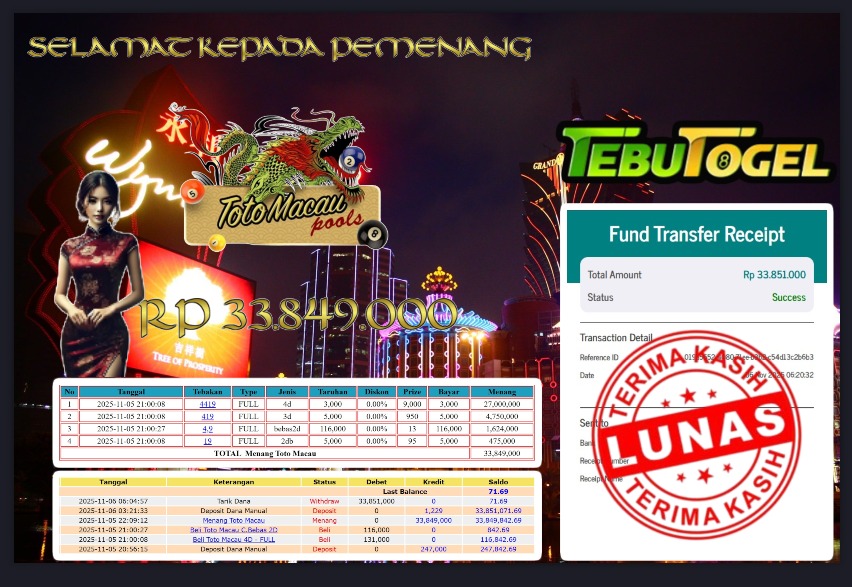 Selamat kepada User id : BSTRS*** telah berhasil mendapatkan kemenangan besar pada permainan TOGEL TOTO MACAU 4D dengan kemenangan sebesar Rp 33.849.000,- Setelah mengisi formulir withdraw dengan kurung waktu hanya 5 – 10 menit pihak TebuTogel sudah melakukan transfer kepada pemilik User id dan dana sudah dapat dicairkan oleh pemenang. Bukti pembayaran yang kami berikan merupakan bukti pembayaran yang SAH / VALID yang langung didapatkan melalui tanda transfer transaksi dari Bank yang dituju.