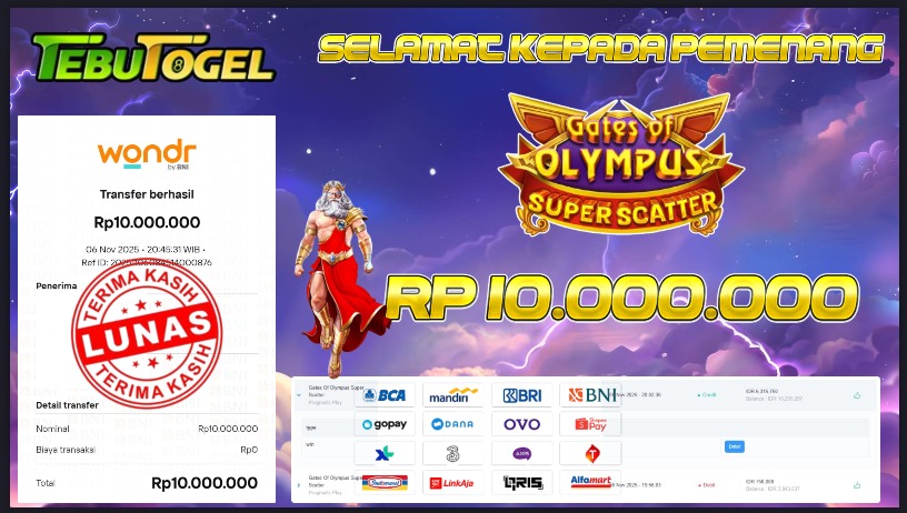 Selamat kepada User id : BRNSA*** telah berhasil mendapatkan kemenangan besar pada permainan SLOT GATES OF OLYMPUS SUPER SCATTER dengan kemenangan sebesar Rp 10.000.000,- Setelah mengisi formulir withdraw dengan kurung waktu hanya 5 – 10 menit pihak TebuTogel sudah melakukan transfer kepada pemilik User id dan dana sudah dapat dicairkan oleh pemenang. Bukti pembayaran yang kami berikan merupakan bukti pembayaran yang SAH / VALID yang langung didapatkan melalui tanda transfer transaksi dari Bank yang dituju.