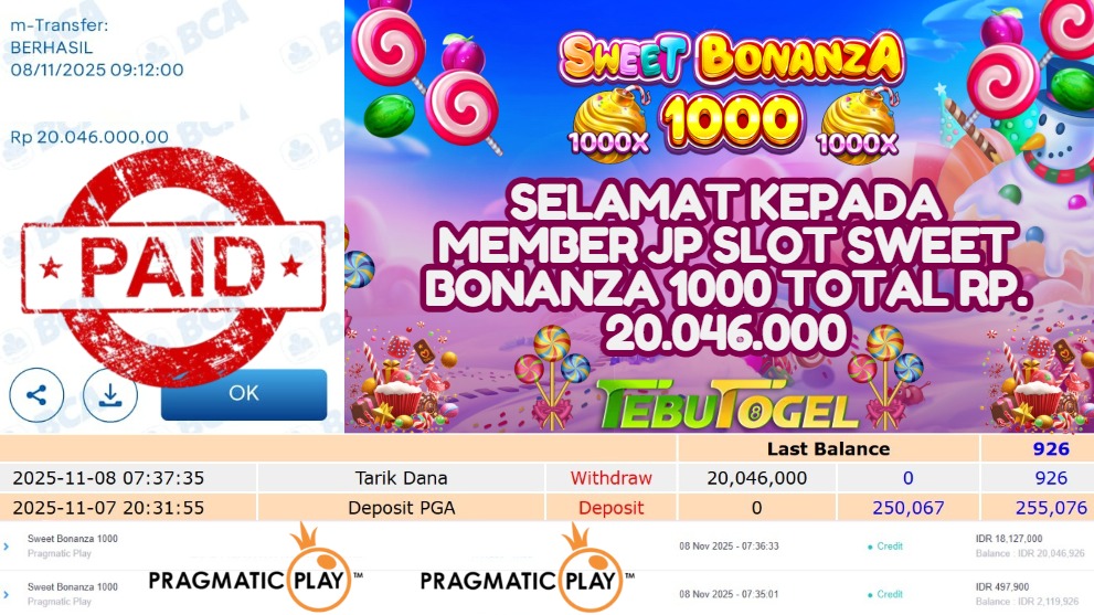Selamat kepada User id : POLO**** telah berhasil mendapatkan kemenangan besar pada permainan SLOT SWEET BONANZA 1000  dengan kemenangan sebesar Rp 20.046.000,- Setelah mengisi formulir withdraw dengan kurung waktu hanya 5 – 10 menit pihak TebuTogel sudah melakukan transfer kepada pemilik User id dan dana sudah dapat dicairkan oleh pemenang. Bukti pembayaran yang kami berikan merupakan bukti pembayaran yang SAH / VALID yang langung didapatkan melalui tanda transfer transaksi dari Bank yang dituju.