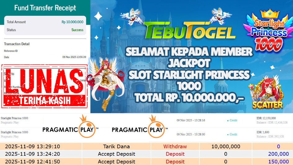 Selamat kepada User id : MAED*** telah berhasil mendapatkan kemenangan besar pada permainan SLOT STARLIGHT PRINCESS 1000 dengan kemenangan sebesar Rp 19.000.000,- Setelah mengisi formulir withdraw dengan kurung waktu hanya 5 – 10 menit pihak TebuTogel sudah melakukan transfer kepada pemilik User id dan dana sudah dapat dicairkan oleh pemenang. Bukti pembayaran yang kami berikan merupakan bukti pembayaran yang SAH / VALID yang langung didapatkan melalui tanda transfer transaksi dari Bank yang dituju.