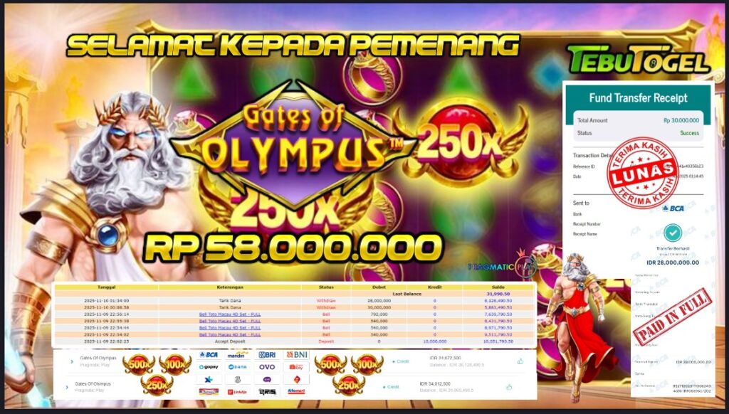 Selamat kepada User id : ARFAS13*** telah berhasil mendapatkan kemenangan besar pada permainan SLOT GATES OF OLYMPUS SUPER SCATTER dengan kemenangan sebesar Rp 58.000.000,- Setelah mengisi formulir withdraw dengan kurung waktu hanya 5 – 10 menit pihak TebuTogel sudah melakukan transfer kepada pemilik User id dan dana sudah dapat dicairkan oleh pemenang. Bukti pembayaran yang kami berikan merupakan bukti pembayaran yang SAH / VALID yang langung didapatkan melalui tanda transfer transaksi dari Bank yang dituju.