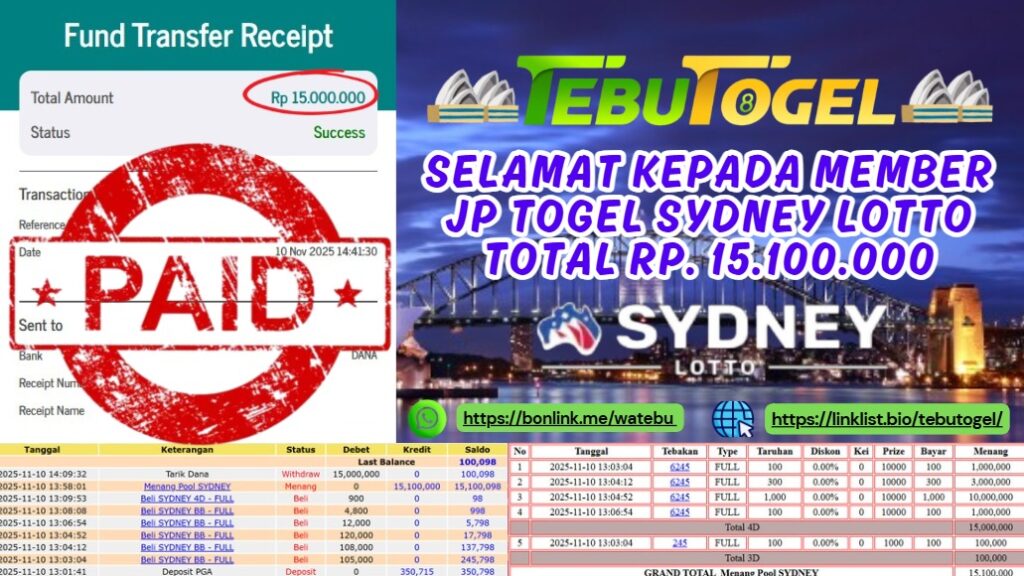 Selamat kepada User id : NONGKI*** telah berhasil mendapatkan kemenangan besar pada permainan TOGEL SYDNEY LOTTO dengan kemenangan sebesar Rp 15.100.000,- Setelah mengisi formulir withdraw dengan kurung waktu hanya 5 – 10 menit pihak TebuTogel sudah melakukan transfer kepada pemilik User id dan dana sudah dapat dicairkan oleh pemenang. Bukti pembayaran yang kami berikan merupakan bukti pembayaran yang SAH / VALID yang langung didapatkan melalui tanda transfer transaksi dari Bank yang dituju.