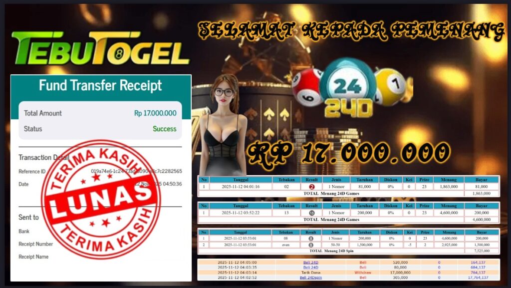 Selamat kepada User id : MINST*** telah berhasil mendapatkan kemenangan besar pada permainan LIVE GAMES 24D dengan kemenangan sebesar Rp 17.000.000,- Setelah mengisi formulir withdraw dengan kurung waktu hanya 5 – 10 menit pihak TebuTogel sudah melakukan transfer kepada pemilik User id dan dana sudah dapat dicairkan oleh pemenang. Bukti pembayaran yang kami berikan merupakan bukti pembayaran yang SAH / VALID yang langung didapatkan melalui tanda transfer transaksi dari Bank yang dituju.