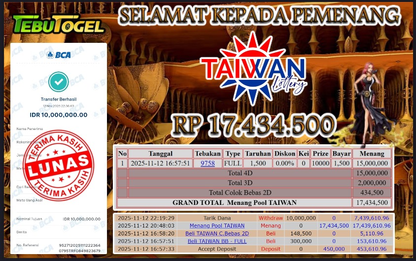 Selamat kepada User id : AMAP*** telah berhasil mendapatkan kemenangan besar pada permainan TOGEL TOGEL TAIWAN dengan kemenangan sebesar Rp 17.434.500,- Setelah mengisi formulir withdraw dengan kurung waktu hanya 5 – 10 menit pihak TebuTogel sudah melakukan transfer kepada pemilik User id dan dana sudah dapat dicairkan oleh pemenang. Bukti pembayaran yang kami berikan merupakan bukti pembayaran yang SAH / VALID yang langung didapatkan melalui tanda transfer transaksi dari Bank yang dituju.