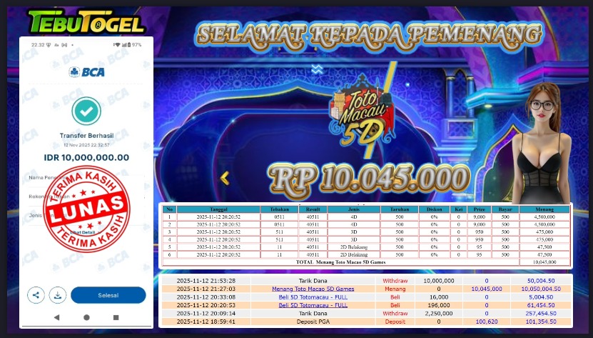 Selamat kepada User id : LAPLAP13*** telah berhasil mendapatkan kemenangan besar pada permainan TOGEL TOGEL TOTO MACAU 5D dengan kemenangan sebesar Rp 10.045.000,- Setelah mengisi formulir withdraw dengan kurung waktu hanya 5 – 10 menit pihak TebuTogel sudah melakukan transfer kepada pemilik User id dan dana sudah dapat dicairkan oleh pemenang. Bukti pembayaran yang kami berikan merupakan bukti pembayaran yang SAH / VALID yang langung didapatkan melalui tanda transfer transaksi dari Bank yang dituju.