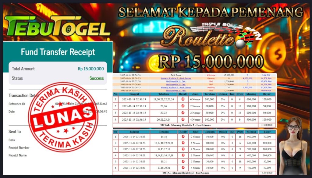 Selamat kepada User id : RAGW*** telah berhasil mendapatkan kemenangan besar pada permainan LIVE GAME ROULETTE dengan kemenangan sebesar Rp 15.000.000,- Setelah mengisi formulir withdraw dengan kurung waktu hanya 5 – 10 menit pihak TebuTogel sudah melakukan transfer kepada pemilik User id dan dana sudah dapat dicairkan oleh pemenang. Bukti pembayaran yang kami berikan merupakan bukti pembayaran yang SAH / VALID yang langung didapatkan melalui tanda transfer transaksi dari Bank yang dituju.
