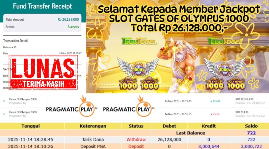 Selamat kepada User id : DINGIN*** telah berhasil mendapatkan kemenangan besar pada permainan SLOT GATES OF OLYMPUS 1000 dengan kemenangan sebesar Rp 26.128.000,- Setelah mengisi formulir withdraw dengan kurung waktu hanya 5 – 10 menit pihak TebuTogel sudah melakukan transfer kepada pemilik User id dan dana sudah dapat dicairkan oleh pemenang. Bukti pembayaran yang kami berikan merupakan bukti pembayaran yang SAH / VALID yang langung didapatkan melalui tanda transfer transaksi dari Bank yang dituju.
