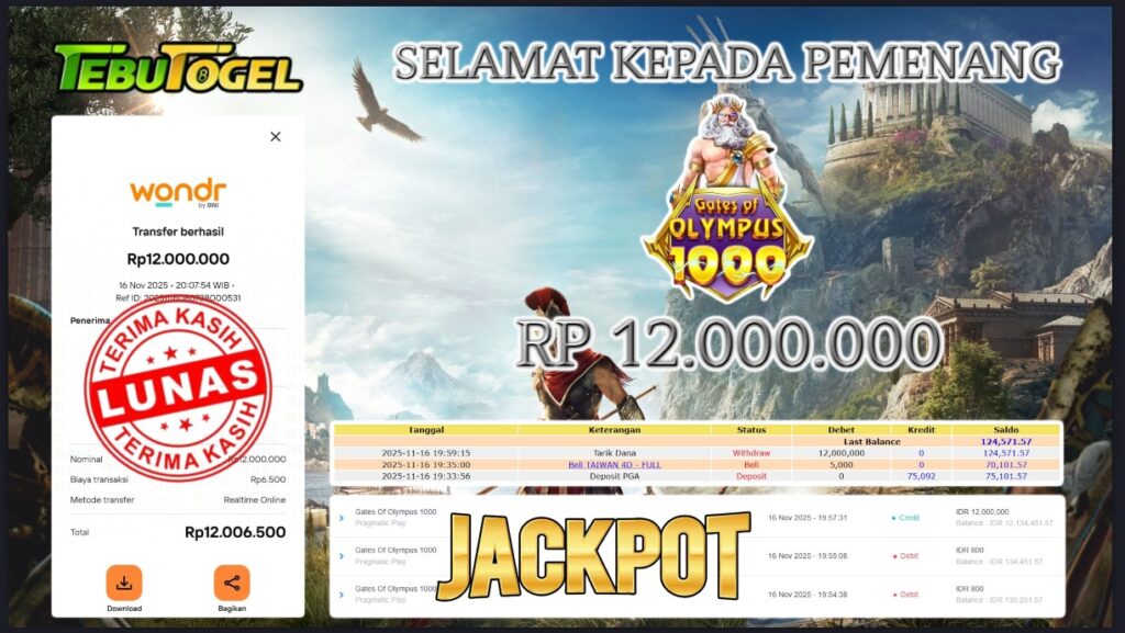 Selamat kepada User id : COOLEER*** telah berhasil mendapatkan kemenangan besar pada permainan SLOT GATES OF OLYMPUS 1000 dengan kemenangan sebesar Rp 12.000.000,- Setelah mengisi formulir withdraw dengan kurung waktu hanya 5 – 10 menit pihak TebuTogel sudah melakukan transfer kepada pemilik User id dan dana sudah dapat dicairkan oleh pemenang. Bukti pembayaran yang kami berikan merupakan bukti pembayaran yang SAH / VALID yang langung didapatkan melalui tanda transfer transaksi dari Bank yang dituju.