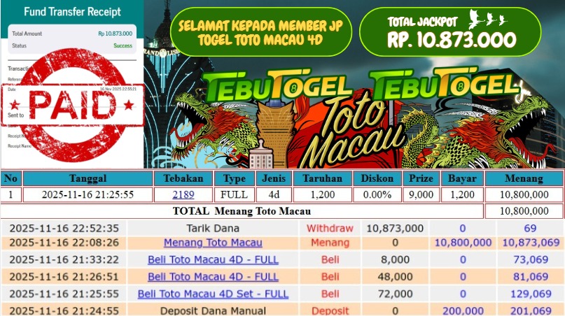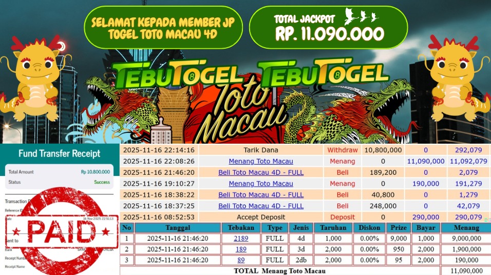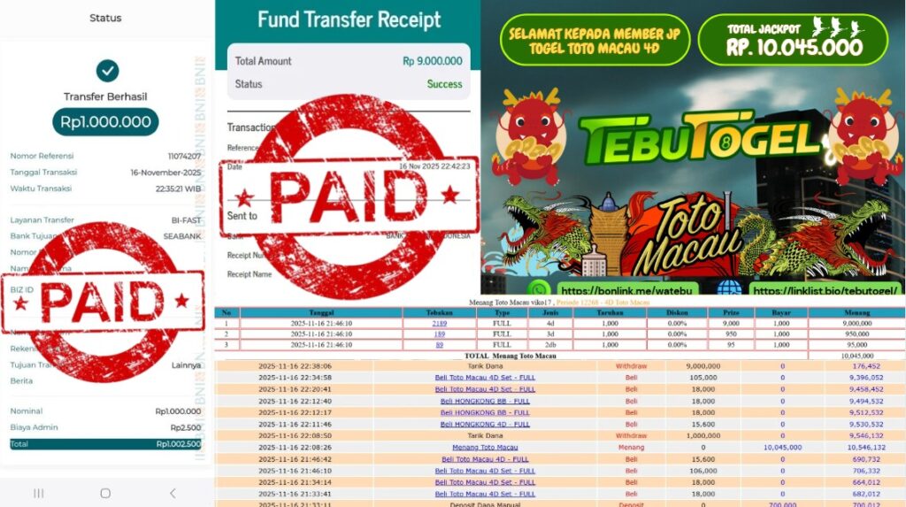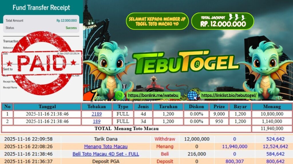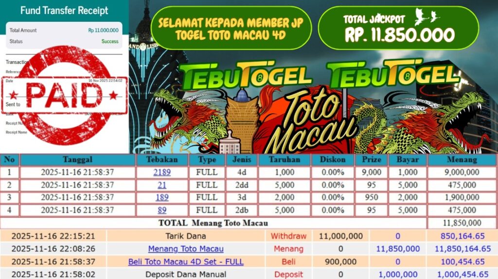 Selamat kepada User id : LUTS*** telah berhasil mendapatkan kemenangan besar pada permainan TOGEL TOGEL TOTO MACAU 4D dengan kemenangan … Baca selengkapnya...