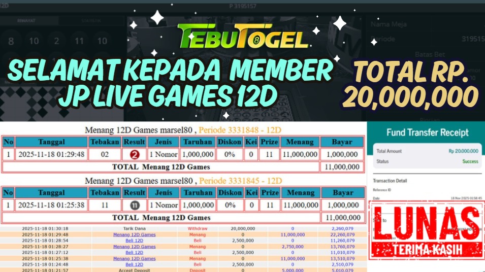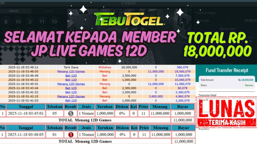 BUKTI JACKPOT LIVE GAME 12D Rp 18.000.000,- LUNAS