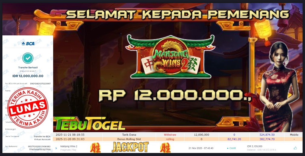 Selamat kepada User id :ROLA*** telah berhasil mendapatkan kemenangan besar pada permainan SLOT MAHJONG WINS 2 dengan kemenangan sebesar Rp 12.000.000,- Setelah mengisi formulir withdraw dengan kurung waktu hanya 5 – 10 menit pihak TebuTogel sudah melakukan transfer kepada pemilik User id dan dana sudah dapat dicairkan oleh pemenang. Bukti pembayaran yang kami berikan merupakan bukti pembayaran yang SAH / VALID yang langung didapatkan melalui tanda transfer transaksi dari Bank yang dituju.