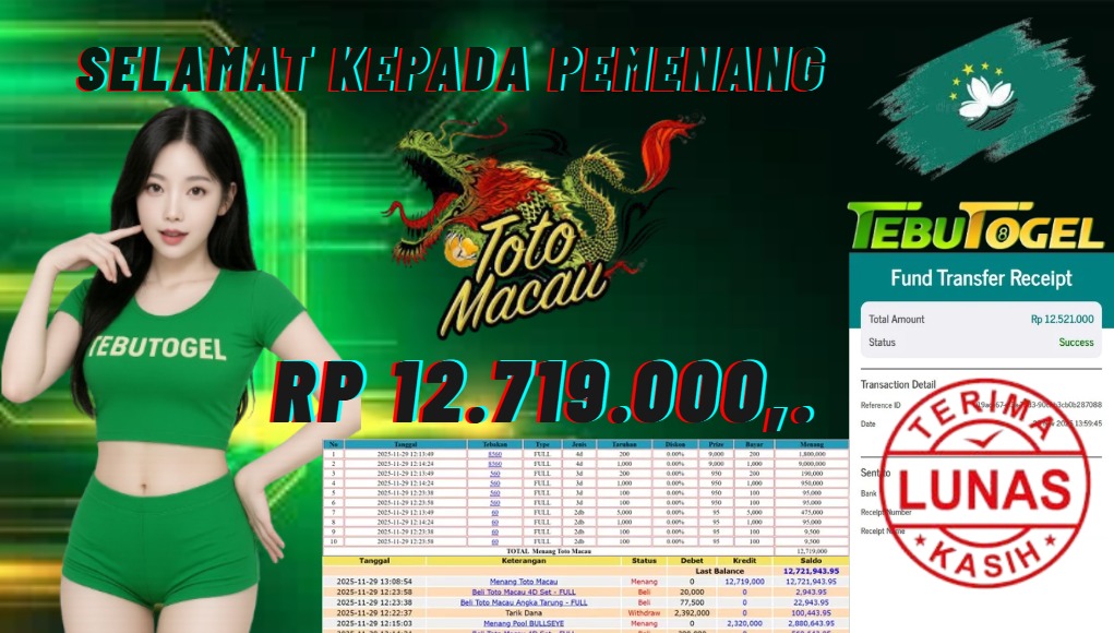 Selamat kepada User id : OZAWA*** telah berhasil mendapatkan kemenangan besar pada permainan TOGEL TOTO MACAU dengan kemenangan sebesar Rp 12.719.000,- Setelah mengisi formulir withdraw dengan kurung waktu hanya 5 – 10 menit pihak TebuTogel sudah melakukan transfer kepada pemilik User id dan dana sudah dapat dicairkan oleh pemenang. Bukti pembayaran yang kami berikan merupakan bukti pembayaran yang SAH / VALID yang langung didapatkan melalui tanda transfer transaksi dari Bank yang dituju.