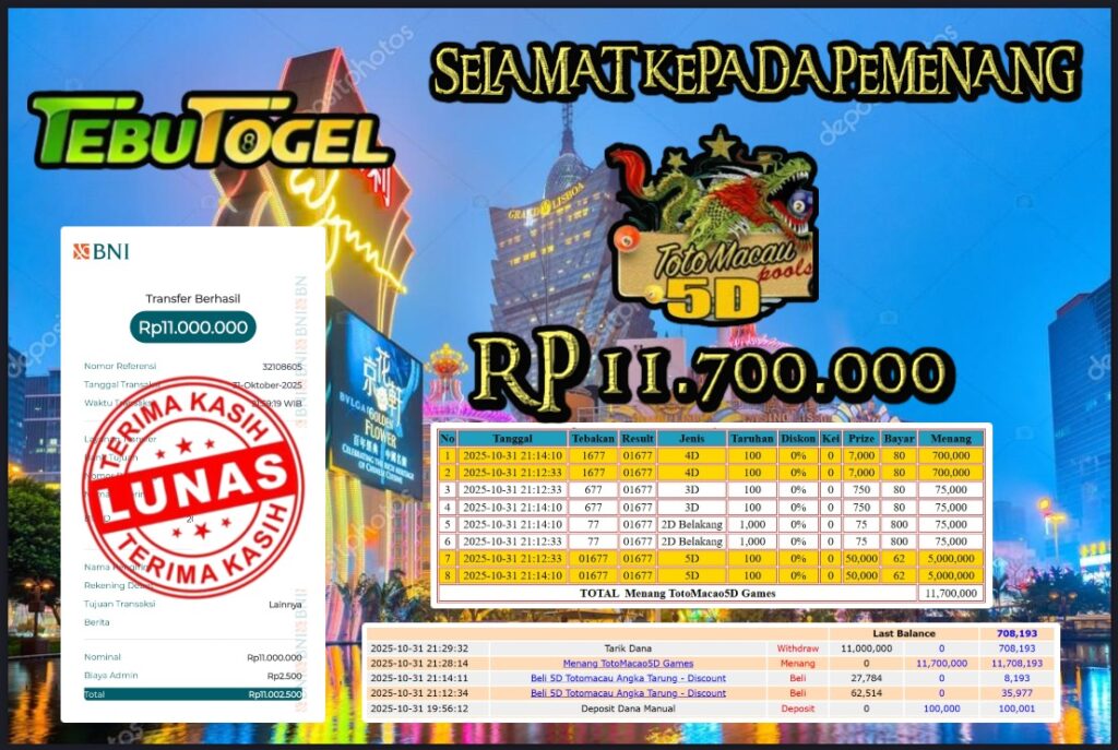 Selamat kepada User id : REYNA*** telah berhasil mendapatkan kemenangan besar pada permainan TOGEL TOTO MACAU 5D dengan kemenangan sebesar … Baca selengkapnya...