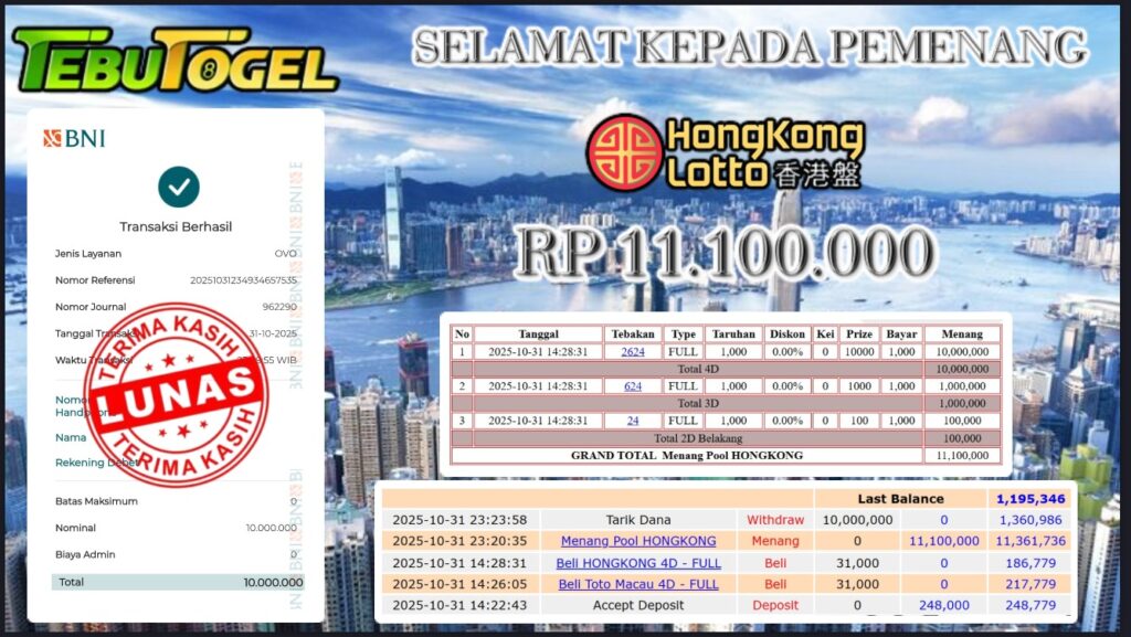 Selamat kepada User id : WIRHA**** telah berhasil mendapatkan kemenangan besar pada permainan TOGEL HONGKONG LOTTO dengan kemenangan … Baca selengkapnya...