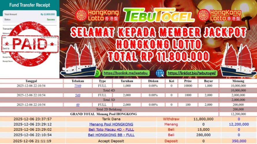 Selamat kepada User id : MXO** telah berhasil mendapatkan kemenangan besar pada permainan TOGEL HONGKONG LOTTO dengan kemenangan sebesar Rp 11.800.000,- Setelah mengisi formulir withdraw dengan kurung waktu hanya 5 – 10 menit pihak Tebutogel sudah melakukan transfer kepada pemilik User id dan dana sudah dapat dicairkan oleh pemenang. Bukti pembayaran yang kami berikan merupakan bukti pembayaran yang SAH / VALID yang langung didapatkan melalui tanda transfer transaksi dari Bank yang dituju.