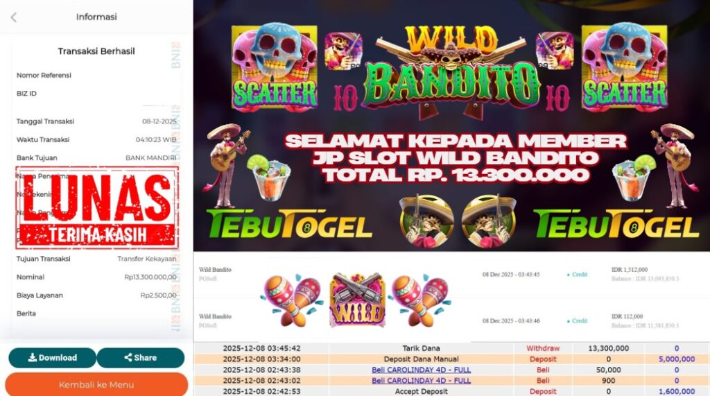 Selamat kepada User id : BOG*** telah berhasil mendapatkan kemenangan besar pada permainan SLOT WILD BANDITO dengan kemenangan sebesar Rp 13.300.000,- Setelah mengisi formulir withdraw dengan kurung waktu hanya 5 – 10 menit pihak TebuTogel sudah melakukan transfer kepada pemilik User id dan dana sudah dapat dicairkan oleh pemenang. Bukti pembayaran yang kami berikan merupakan bukti pembayaran yang SAH / VALID yang langung didapatkan melalui tanda transfer transaksi dari Bank yang dituju.