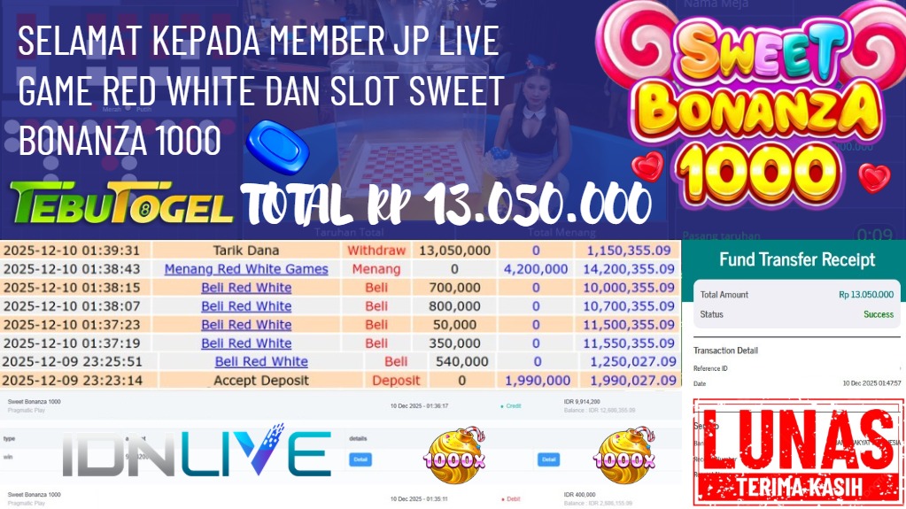 Selamat kepada User id : NUNUH*** telah berhasil mendapatkan kemenangan besar pada permainan LIVE GAME RED WHITE DAN SLOT SWEET BONANZA 1000 dengan kemenangan sebesar Rp 13.050.000,- Setelah mengisi formulir withdraw dengan kurung waktu hanya 5 – 10 menit pihak TebuTogel sudah melakukan transfer kepada pemilik User id dan dana sudah dapat dicairkan oleh pemenang. Bukti pembayaran yang kami berikan merupakan bukti pembayaran yang SAH / VALID yang langung didapatkan melalui tanda transfer transaksi dari Bank yang dituju.