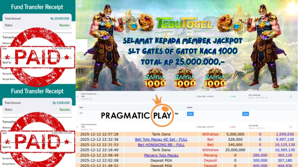 Selamat kepada User id : MONYON** telah berhasil mendapatkan kemenangan besar pada permainan SLOT GATES OF GATOT KACA 1000 dengan kemenangan sebesar Rp 25.000.000,- Setelah mengisi formulir withdraw dengan kurung waktu hanya 5 – 10 menit pihak Tebutogel sudah melakukan transfer kepada pemilik User id dan dana sudah dapat dicairkan oleh pemenang. Bukti pembayaran yang kami berikan merupakan bukti pembayaran yang SAH / VALID yang langung didapatkan melalui tanda transfer transaksi dari Bank yang dituju.