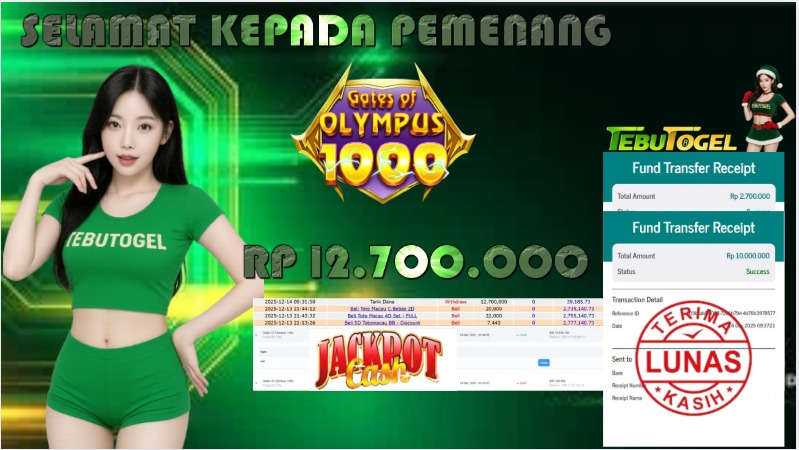 Selamat kepada User id : GYTS** telah berhasil mendapatkan kemenangan besar pada permainan SLOT GATES OF OLYMPUS 1000 dengan kemenangan sebesar Rp 12.700.000,- Setelah mengisi formulir withdraw dengan kurung waktu hanya 5 – 10 menit pihak TebuTogel sudah melakukan transfer kepada pemilik User id dan dana sudah dapat dicairkan oleh pemenang. Bukti pembayaran yang kami berikan merupakan bukti pembayaran yang SAH / VALID yang langung didapatkan melalui tanda transfer transaksi dari Bank yang dituju.