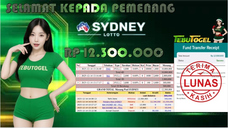 Selamat kepada User id : GUNDA*** telah berhasil mendapatkan kemenangan besar pada permainan TOGEL SYDNEY LOTTO dengan kemenangan sebesar Rp 12.300.000,- Setelah mengisi formulir withdraw dengan kurung waktu hanya 5 – 10 menit pihak TebuTogel sudah melakukan transfer kepada pemilik User id dan dana sudah dapat dicairkan oleh pemenang. Bukti pembayaran yang kami berikan merupakan bukti pembayaran yang SAH / VALID yang langung didapatkan melalui tanda transfer transaksi dari Bank yang dituju.