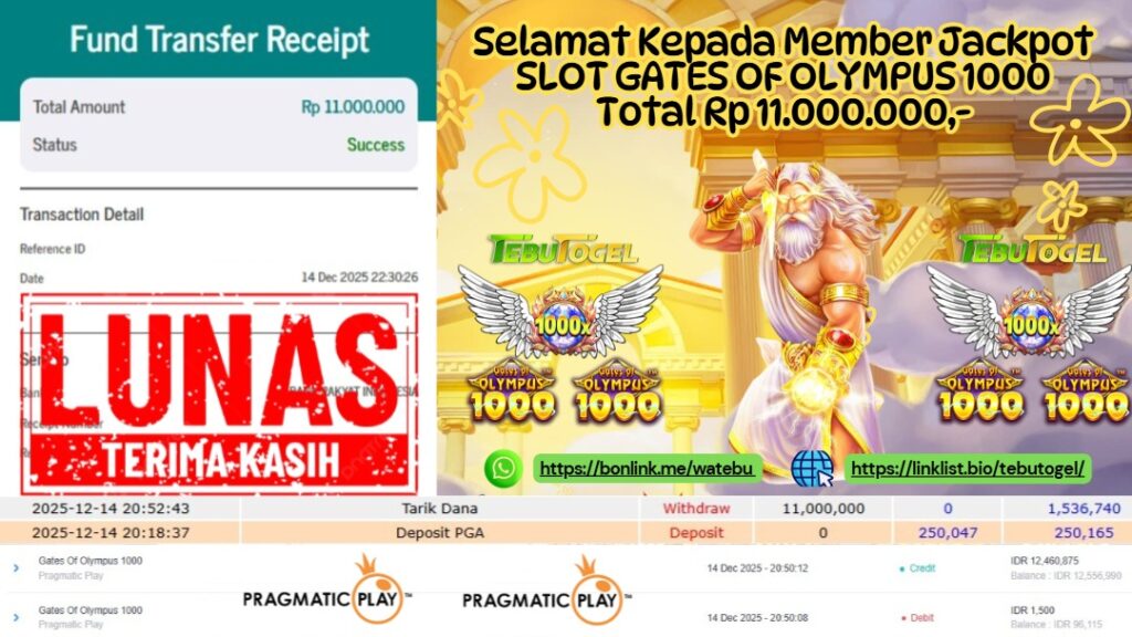 Selamat kepada User id : ALICE** telah berhasil mendapatkan kemenangan besar pada permainan SLOT GATES OF OLYMPUS 1000 dengan kemenangan sebesar Rp 14.500.000- Setelah mengisi formulir withdraw dengan kurung waktu hanya 5 – 10 menit pihak TebuTogel sudah melakukan transfer kepada pemilik User id dan dana sudah dapat dicairkan oleh pemenang. Bukti pembayaran yang kami berikan merupakan bukti pembayaran yang SAH / VALID yang langung didapatkan melalui tanda transfer transaksi dari Bank yang dituju.