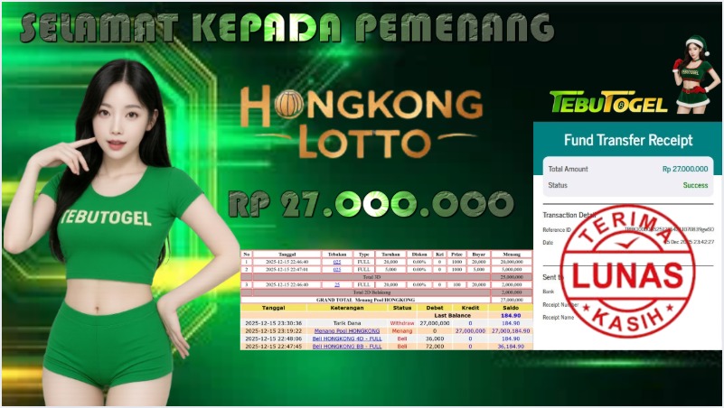 Selamat kepada User id : HIJUS*** telah berhasil mendapatkan kemenangan besar pada permainan TOGEL HONGKONG LOTTO dengan kemenangan sebesar Rp 27.000.000,- Setelah mengisi formulir withdraw dengan kurung waktu hanya 5 – 10 menit pihak TebuTogel sudah melakukan transfer kepada pemilik User id dan dana sudah dapat dicairkan oleh pemenang. Bukti pembayaran yang kami berikan merupakan bukti pembayaran yang SAH / VALID yang langung didapatkan melalui tanda transfer transaksi dari Bank yang dituju.