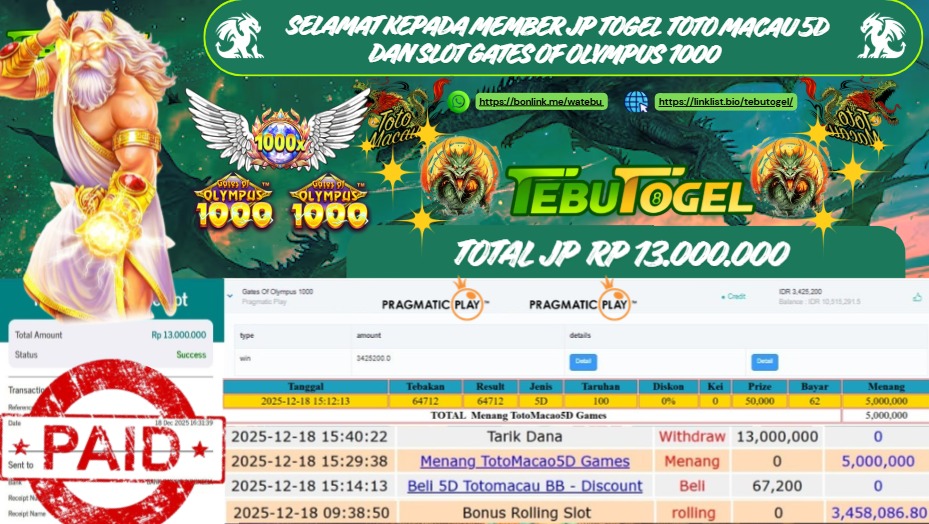 Selamat kepada User id : LOLA*** telah berhasil mendapatkan kemenangan besar pada permainan TOGEL TOTO MACAU 5D DAN SLOT GATES OF OLYMPYUS 1000 dengan kemenangan sebesar Rp 13.000.000- Setelah mengisi formulir withdraw dengan kurung waktu hanya 5 – 10 menit pihak TebuTogel sudah melakukan transfer kepada pemilik User id dan dana sudah dapat dicairkan oleh pemenang. Bukti pembayaran yang kami berikan merupakan bukti pembayaran yang SAH / VALID yang langung didapatkan melalui tanda transfer transaksi dari Bank yang dituju.