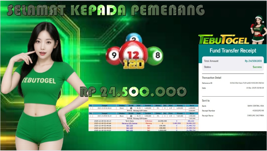 Selamat kepada User id : AMLESA*** telah berhasil mendapatkan kemenangan besar pada permainan LIVE GAME 12D dengan kemenangan sebesar Rp 24.500.000,- Setelah mengisi formulir withdraw dengan kurung waktu hanya 5 – 10 menit pihak TebuTogel sudah melakukan transfer kepada pemilik User id dan dana sudah dapat dicairkan oleh pemenang. Bukti pembayaran yang kami berikan merupakan bukti pembayaran yang SAH / VALID yang langung didapatkan melalui tanda transfer transaksi dari Bank yang dituju.
