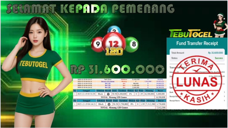 Selamat kepada User id : NIYAAS*** telah berhasil mendapatkan kemenangan besar pada permainan LIVE GAME 12D  dengan kemenangan sebesar Rp 31.600.000,- Setelah mengisi formulir withdraw dengan kurung waktu hanya 5 – 10 menit pihak TebuTogel sudah melakukan transfer kepada pemilik User id dan dana sudah dapat dicairkan oleh pemenang. Bukti pembayaran yang kami berikan merupakan bukti pembayaran yang SAH / VALID yang langung didapatkan melalui tanda transfer transaksi dari Bank yang dituju.
