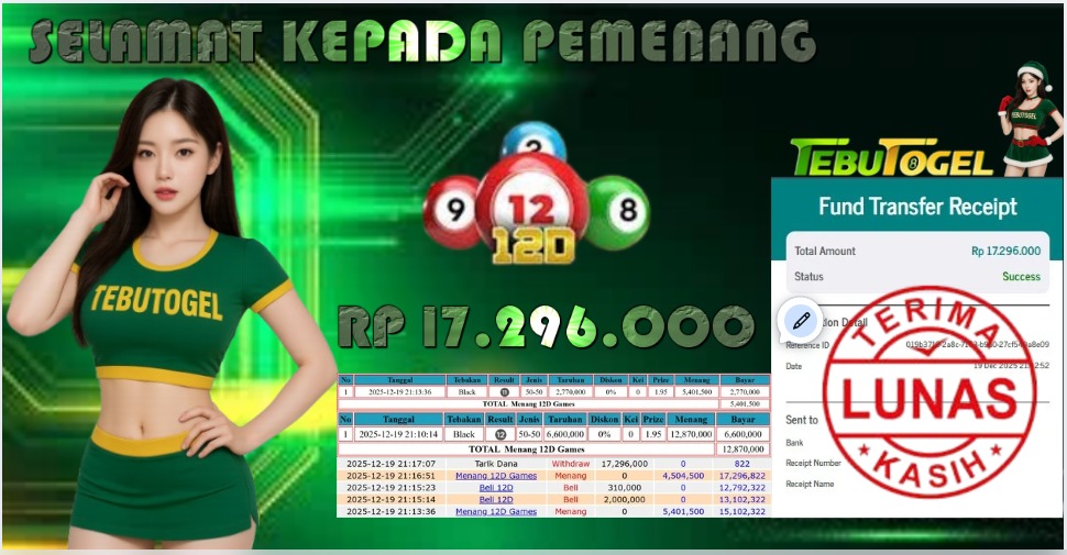 Selamat kepada User id : BYTA telah berhasil mendapatkan kemenangan besar pada permainan LIVE GAMES 12D dengan kemenangan sebesar Rp 17.296.000,- Setelah mengisi formulir withdraw dengan kurung waktu hanya 5 – 10 menit pihak TebuTogel sudah melakukan transfer kepada pemilik User id dan dana sudah dapat dicairkan oleh pemenang. Bukti pembayaran yang kami berikan merupakan bukti pembayaran yang SAH / VALID yang langung didapatkan melalui tanda transfer transaksi dari Bank yang dituju.