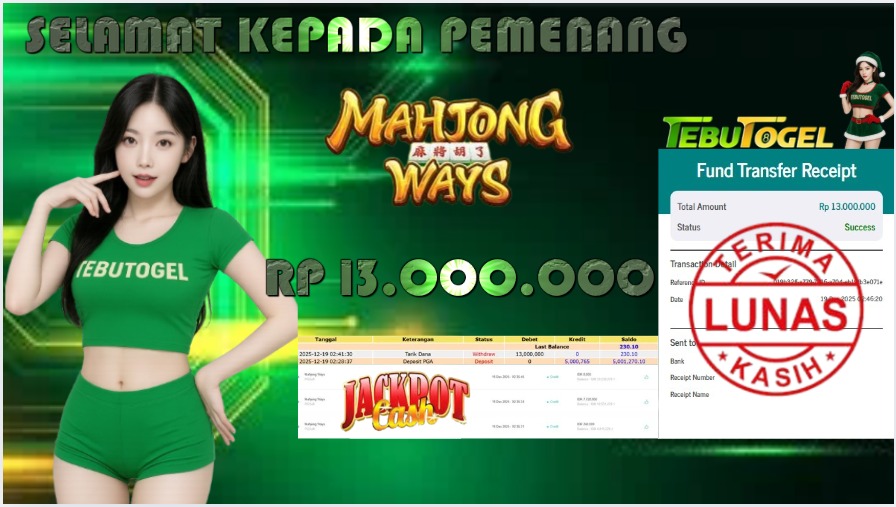 Selamat kepada User id : GTRAS*** telah berhasil mendapatkan kemenangan besar pada permainan SLOT MAHJONG WAYS dengan kemenangan sebesar Rp 13.000.000- Setelah mengisi formulir withdraw dengan kurung waktu hanya 5 – 10 menit pihak TebuTogel sudah melakukan transfer kepada pemilik User id dan dana sudah dapat dicairkan oleh pemenang. Bukti pembayaran yang kami berikan merupakan bukti pembayaran yang SAH / VALID yang langung didapatkan melalui tanda transfer transaksi dari Bank yang dituju.