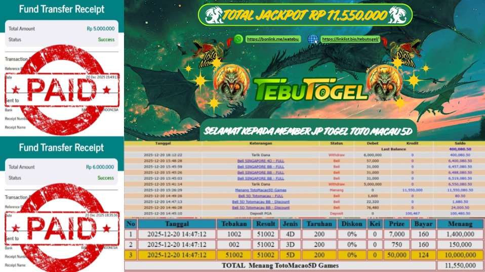 Selamat kepada User id : ANGKA** telah berhasil mendapatkan kemenangan besar pada permainan TOGEL TOTO MACAU 5D dengan kemenangan sebesar Rp 11.550.000,- Setelah mengisi formulir withdraw dengan kurung waktu hanya 5 – 10 menit pihak TebuTogel sudah melakukan transfer kepada pemilik User id dan dana sudah dapat dicairkan oleh pemenang. Bukti pembayaran yang kami berikan merupakan bukti pembayaran yang SAH / VALID yang langung didapatkan melalui tanda transfer transaksi dari Bank yang dituju.