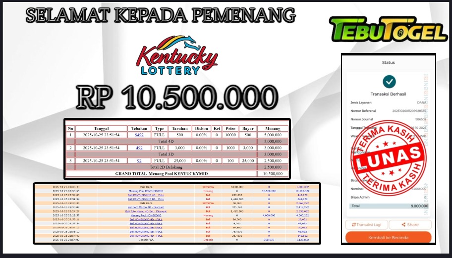 Selamat kepada User id : LAORS**** telah berhasil mendapatkan kemenangan besar pada permainan TOGEL KENTUCKY dengan kemenangan sebesar Rp 10.500.000,-… Baca selengkapnya...