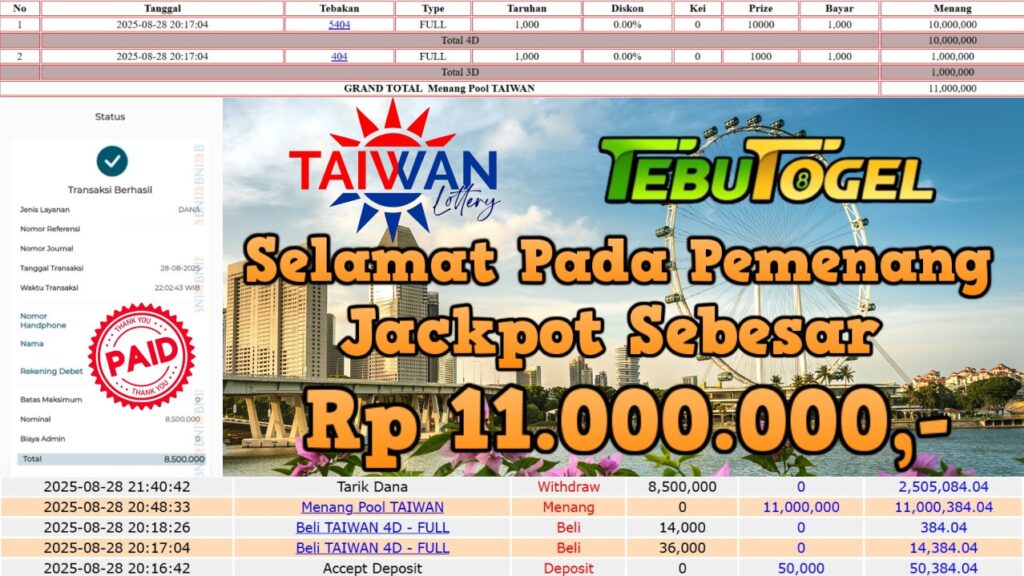 Selamat kepada User id : MSTRTOTO**** telah berhasil mendapatkan kemenangan besar pada permainan TOGEL TAIWAN dengan kemenangan sebesar Rp 11.00.000,-… Baca selengkapnya...