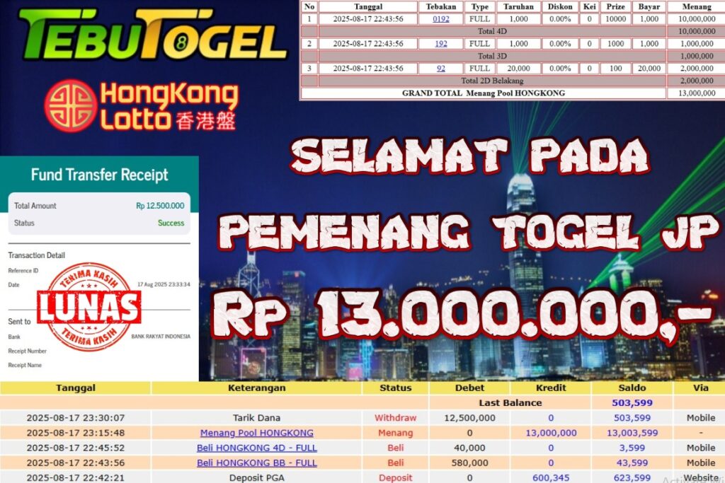 BUKTI JACKPOT TOGEL HONGKONG LOTTO Rp 10.000.000,- LUNAS