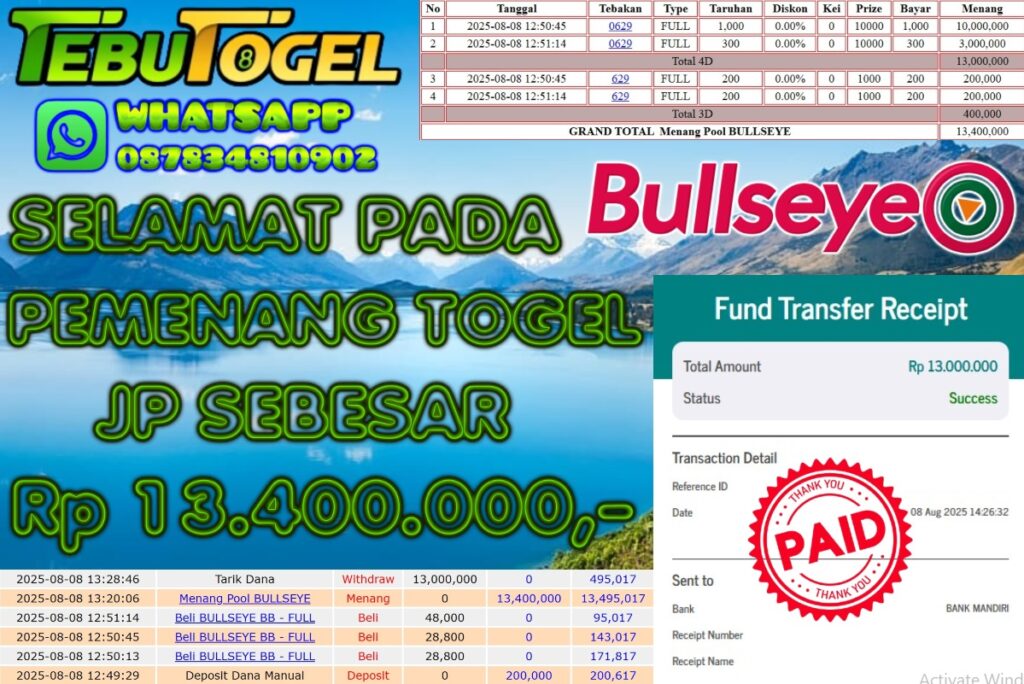 Selamat kepada User id : yuni**** telah berhasil mendapatkan kemenangan besar pada permainan TOGEL BULLSEYEdengan kemenangan sebesar Rp 13.400.000,-… Baca selengkapnya...