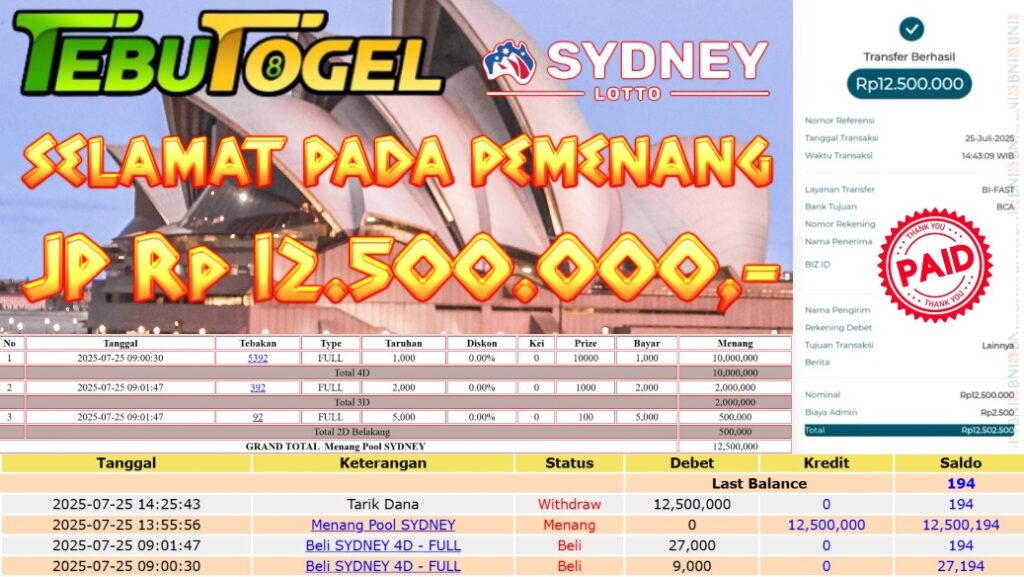 Selamat kepada User id : KUNTUK**** telah berhasil mendapatkan kemenangan besar pada permainan TOGEL SYDNEY dengan kemenangan sebesar Rp … Baca selengkapnya...