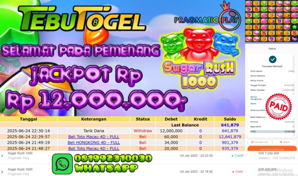 BUKTI JACKPOT SLOT SUGAR RUSH 1000 Rp 12.000.000,- LUNAS