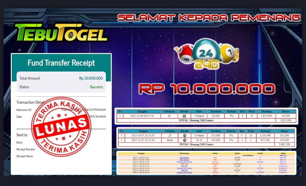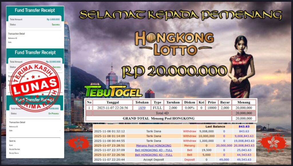 BUKTI JACKPOT TOGEL HONGKONG LOTTO Rp 20.000.000,- LUNAS